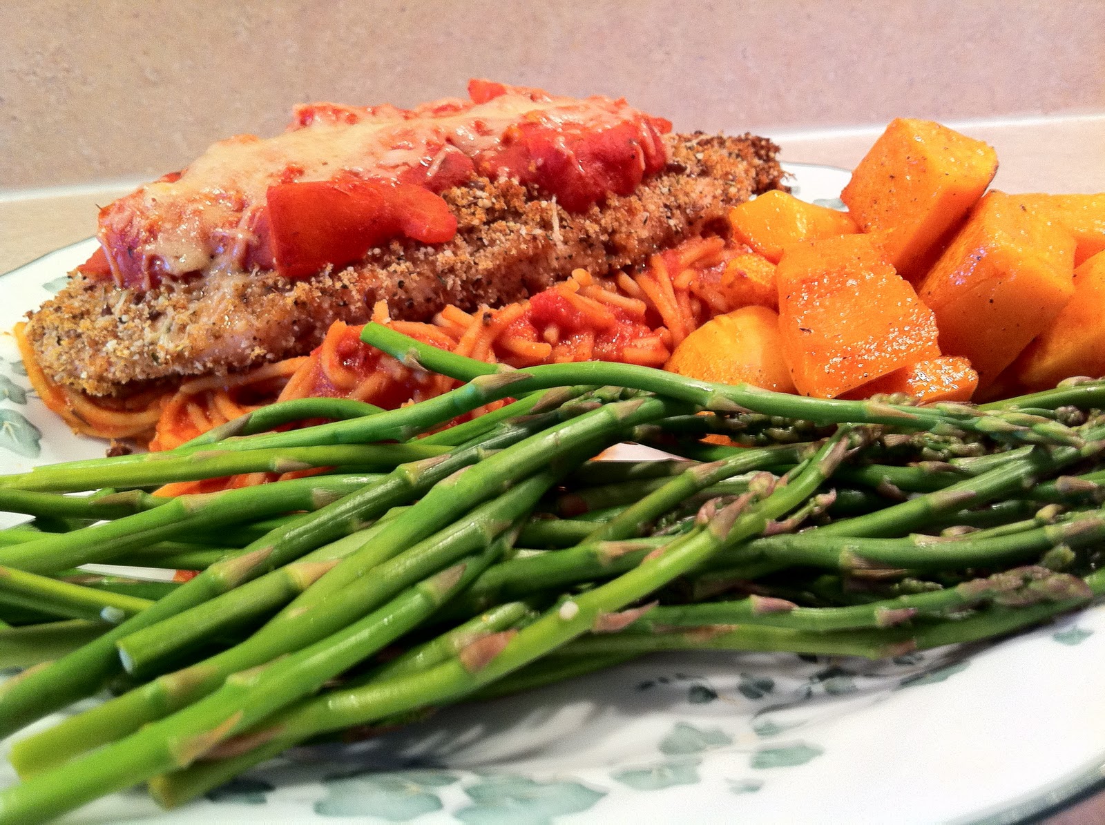 So, I've never really had real chicken parmesan, I assume it's fried. Anyways it's really easy and of coarse - Super healthy! I tried to cut out a lot of fat from this meal after my husband started giving me looks of "Honey - you call this healthy with a half a bottle of olive oil drizzled all over it?" So I am going to do my best to try to stop using so much delicious olive oil... I guess it will cost me a lot less too. But I am still sad.